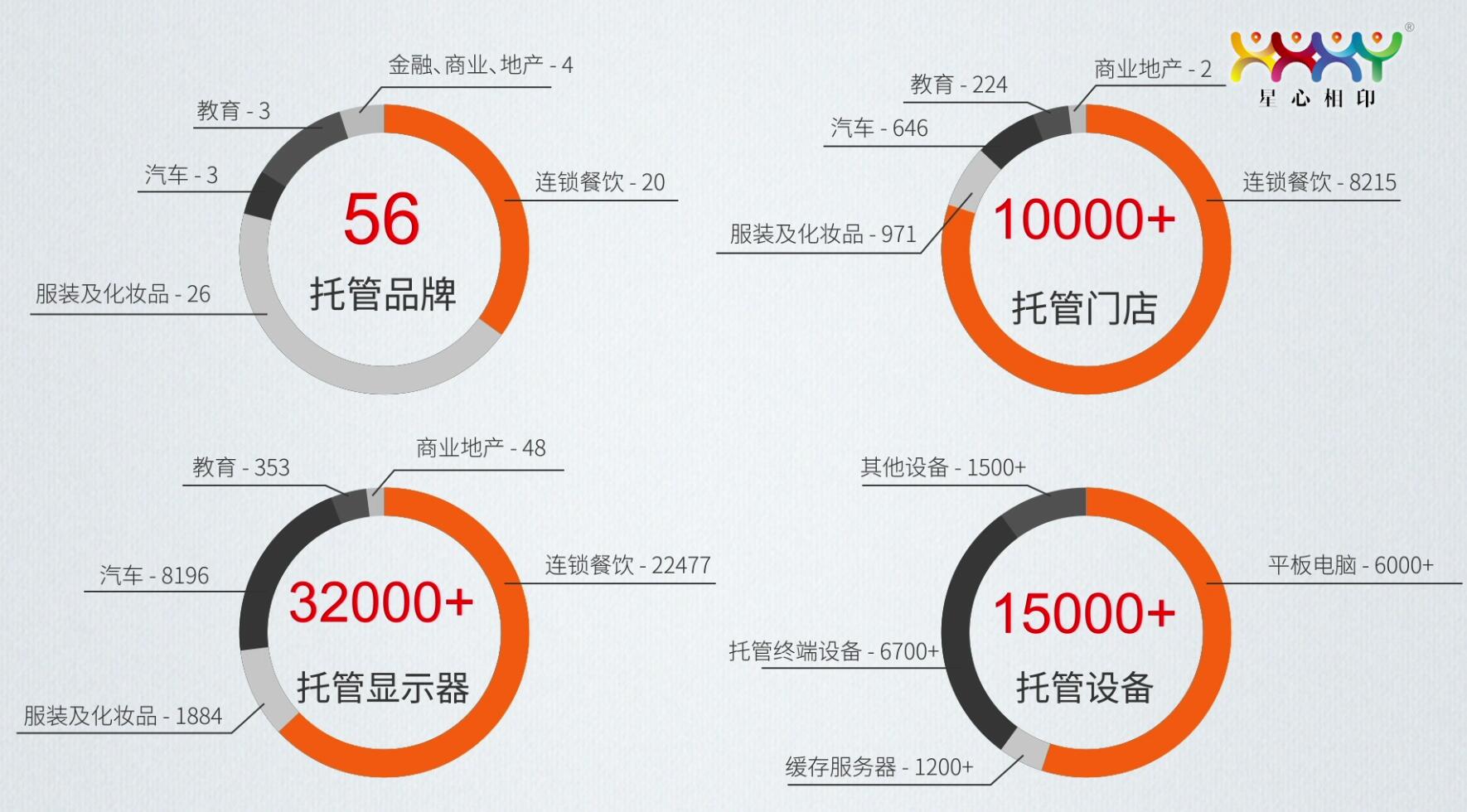 到(dào)目前為(wèi)止,星心相(xiàng)印的(de)托管品牌達到(dào)了(le)56個(gè),托管門(mén)店(diàn)超過1萬,托管顯示器(qì)超過3".2萬,其他(tā)設備的(de)托管數(shù)量也(yě)超過1.5萬。