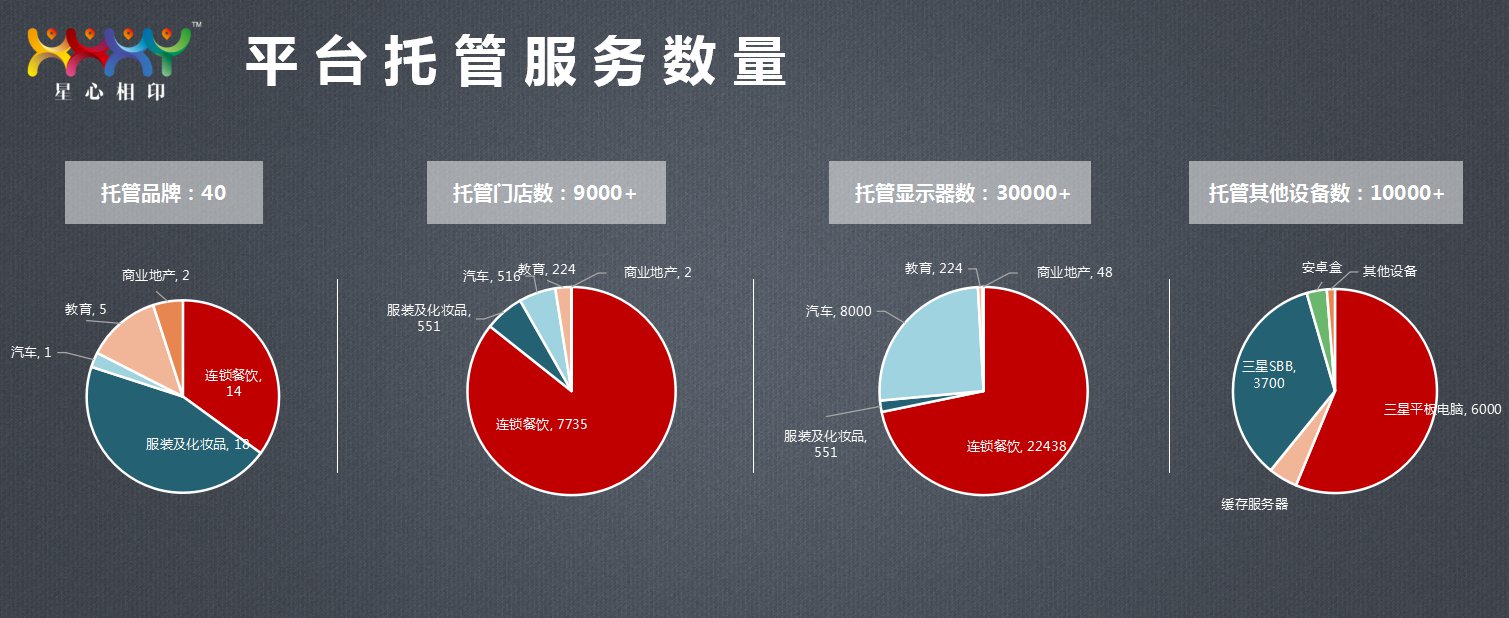 到(dào)目前為(wèi)止,星心相(xiàng)印平台托管品牌多(duō)達40家(jiā)、托管門(mén)店(diàn)近(jìn)萬家(jiā)、托管顯示器(qì)數(shù)量達30★000多(duō)台、其他(tā)設備10000多(duō)台。